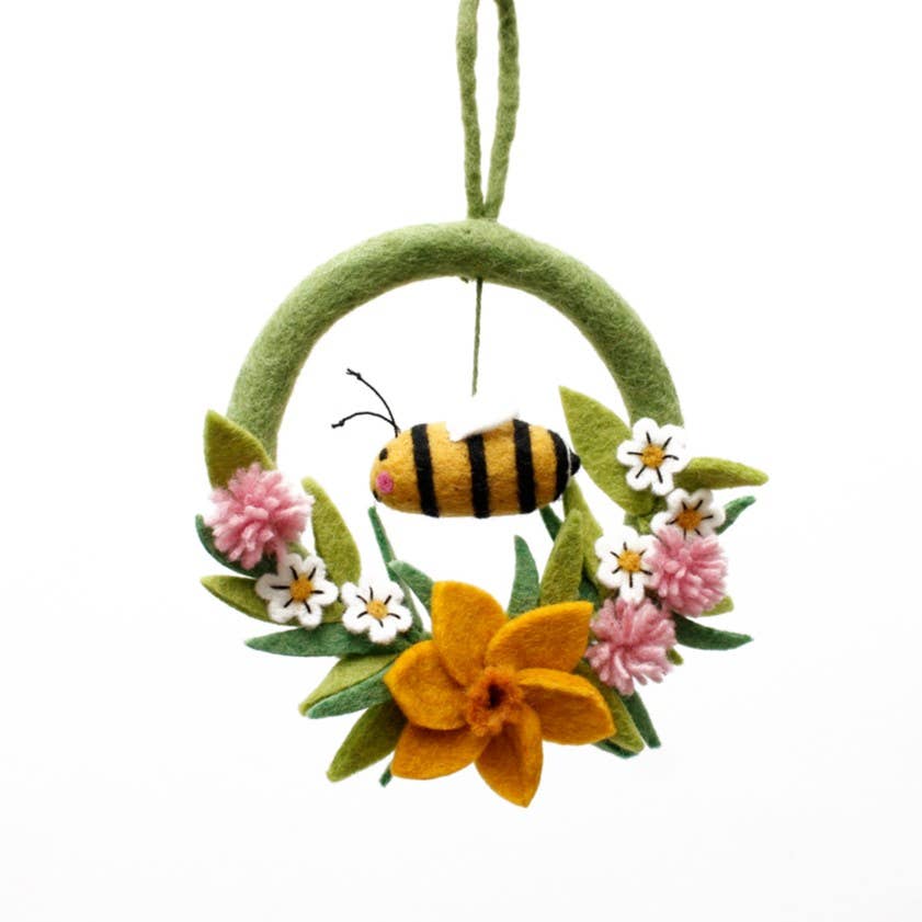 A lovely floral wreath full of Spring flowers - daffodil, clover and daisies with a very happy bee buzzing in the middle. Handmade from 100% wool felt, plastic free, and fair trade.