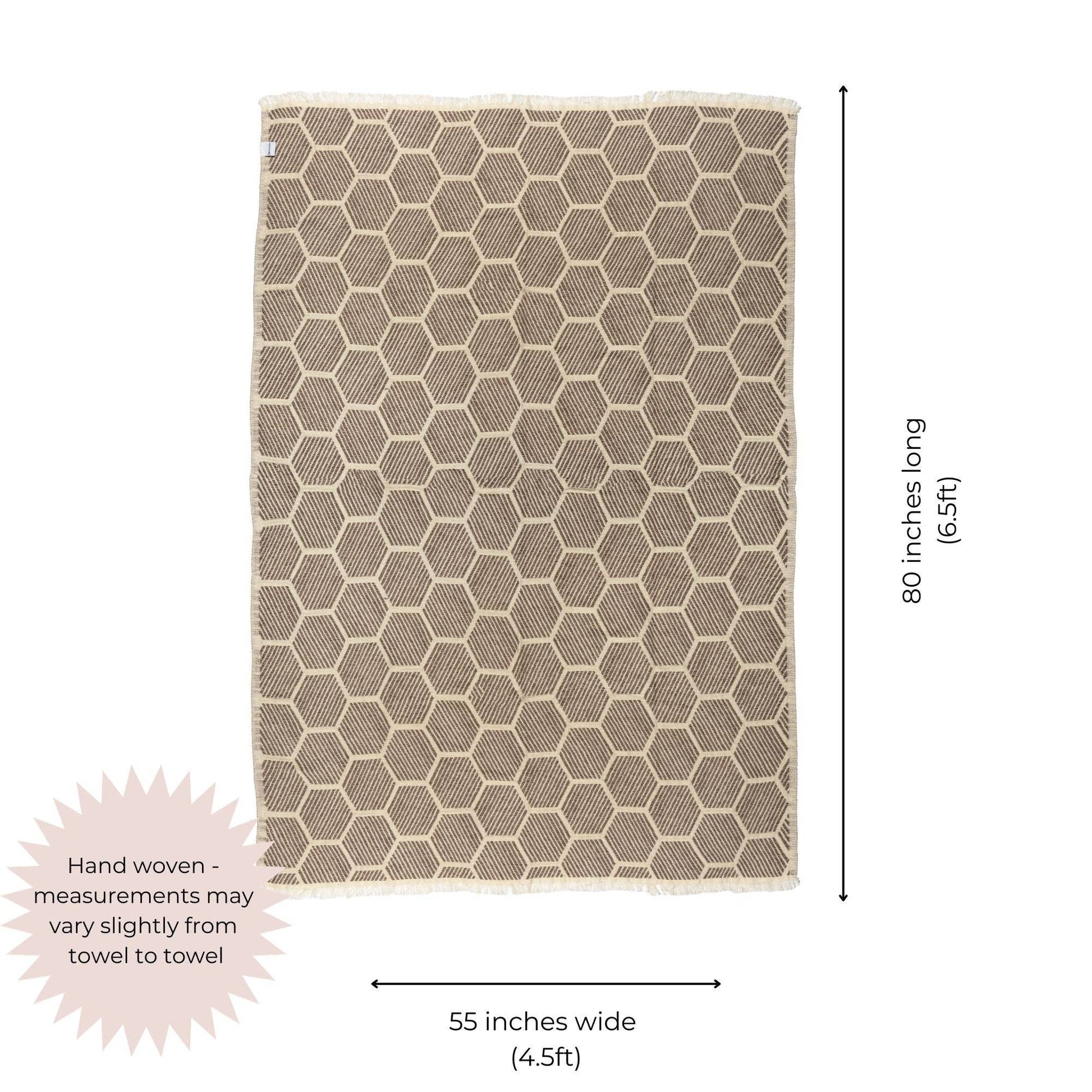 The perfect mix of style and comfort, you will instantly fall in love with our Hive throw blanket with a geometric hexagon pattern! This blanket is reversible to give you 2 unique looks and the soft Turkish cotton will keep you warm and feel great against your skin. * Brown and cream patterned blanket * Perfect as a partial bed cover, sofa or couch throw, picnic blanket and so much more. * Thin and lightweight. Stylish and cozy without the bulk! * Impeccable quality and attention to design. * Reversible – get two different looks with one blanket! Opposite colors on the backside. * Made from 100% Turkish cotton Size: * 80 inches x 55 inches wide (6.5 feet x 4.5 feet) * This blanket is hand woven, and dimensions may vary slightly from blanket to blanket Care: * Machine washable. Cold wash, low heat tumble dry.