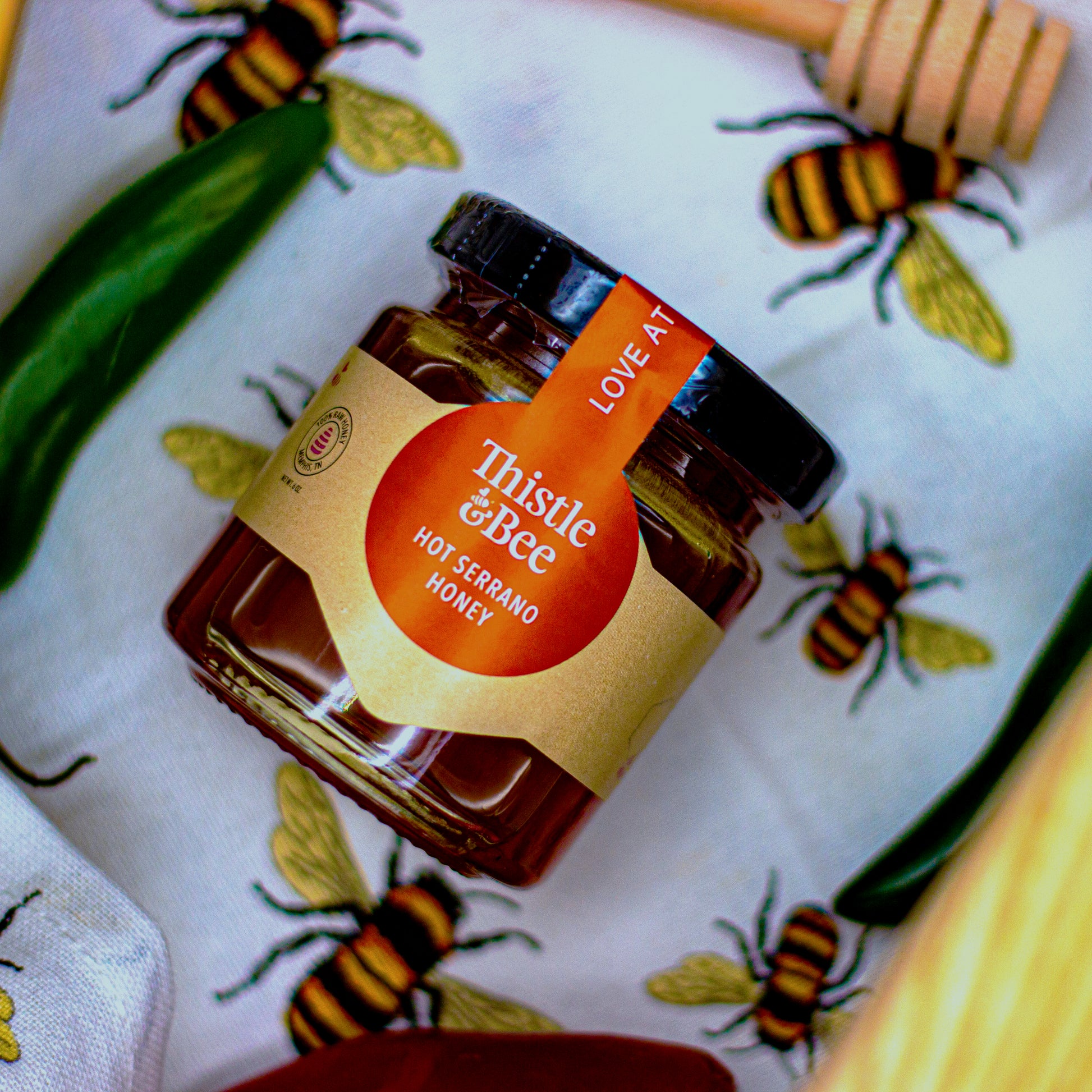 This honey is infused with a touch of heat from serrano and jalapeno peppers for a bit of sweet kick. Perfect to add on chicken or pork or be daring drizzling it over a bowl of vanilla ice cream.